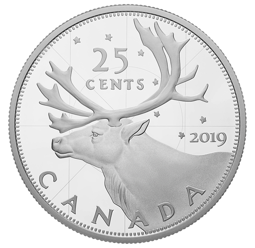 The 25-cent coin re-creates a preliminary sketch of the iconic caribou design by artist Emanuel Hahn. The BigDipper asterism appears behind the left-side profile of Rangifer tarandus, while the denomination “25 CENTS” is positioned between the caribou’s antlers. Laser engraving on flat mimics the artist’s hand-drawn guide lines. The reverse includes the word “CANADA” and an updated date, “2019”. The obverse features theeffigy of King George VI by T. H. Paget.