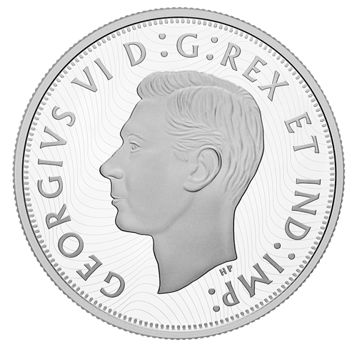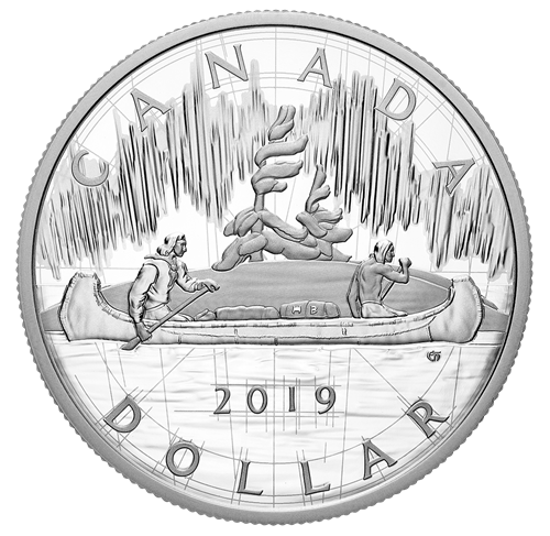 The $1 coin also features Emanuel Hahn’s early take on the Voyageur design that eventually appeared on Canada’s silver dollars (1935-1986). Beneath the aurora borealis, a voyageurand an Indigenous guide paddle a fur-laden canoe past wind-swept pines that rise up from a semi-circular island. Laser engraving on flat mimics the artist’s hand-drawn guide lines. The reverse includes the word “CANADA”, an updated date “2019” and the denomination, “DOLLAR”. The obverse features the effigy of King George VI by T. H. Paget.
