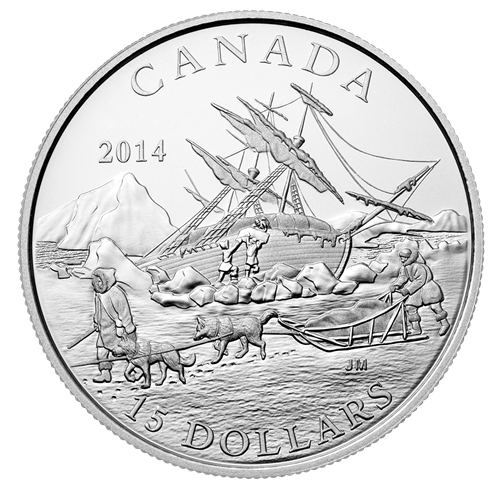Your coin captures the essence of early Arctic exploration—the perilous phase when a ship becomes trapped and potentially crushed by ice and the crew must unload its supplies and travel by foot. Much of their success was achieved through the assistance of the Arctic's indigenous Inuit who generously shared their knowledge of the land, providing food, clothing and equipment, including sledges and dogs as shown in the foreground of the design.