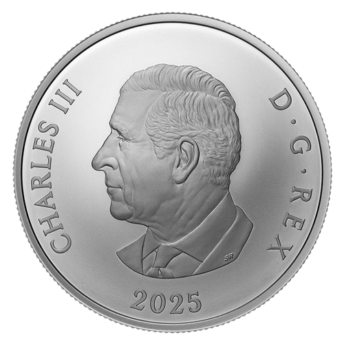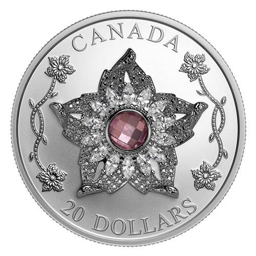 The coin’s reverse features an interpretation of the Williamson Diamond Brooch frequently worn by Queen Elizabeth II throughout her seven-decade reign. Flanked by engraved floral accents inspired by the brooch’s shape, the jewel’s five-petalled flower is a rhodium-plated setting adorned with crystals and a pink-coloured glass stone at its centre. The obverse features the effigy of His Majesty King Charles III by Canadian artist Steven Rosati.