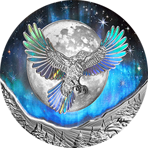- Reach for the moon. Raven soars to new heights under a magical, multicoloured night sky on this hologram-enhanced 1 oz. 99.99% pure silver coin.