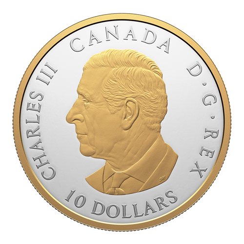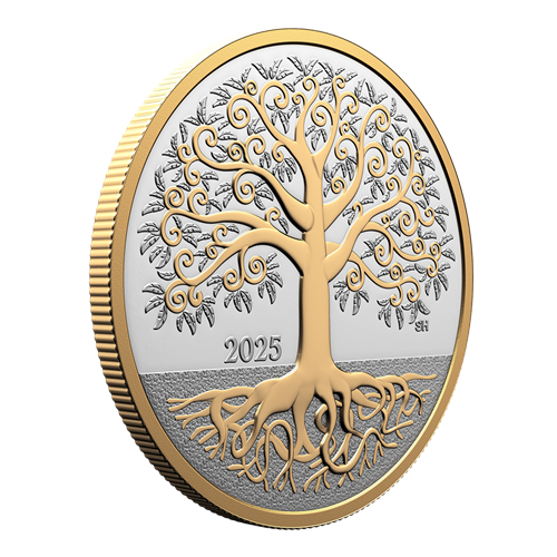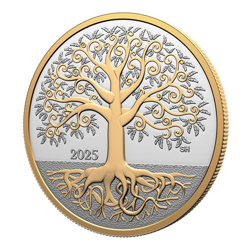 The reverse design by Canadian artist Steve Hepburn features an intricate, artistic representation of the tree of life motif, selectively plated with yellow gold. Buried in the earth that grounds it, the entangled roots provide a solid foundation for the trunk and the leaf-bearing branches that reach up towards the sky. The rim on both sides is also plated with yellow gold, while the obverse features the gold-plated effigy of His Majesty King Charles III by Canadian artist Steven Rosati.
