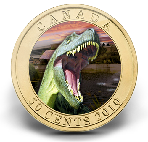 Albertosaurus poised in front of the world-renownedRoyal TyrrellMuseum—an image that gives way to an awesome close-up of itsferocious teeth when the coin is tilted.