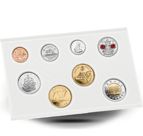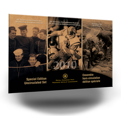 The Royal Canadian Mint is proud to present the 2010 Special Edition Uncirculated Set. This 8-coin set features onecoin of each denomination issued for circulation inCanada. Included are the coloured 25-cent Poppy coin, and two one-dollar coins commemorating both the 100th Anniversary of the Canadian Navy and the Saskatchewan Roughriders Centennial. These uncirculated coins have been carefully selected to provide you withthe best examples of their kind.