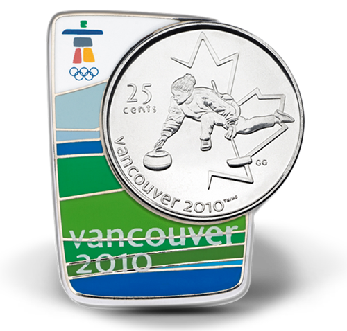 The lapel pin is cleverly designed with a strong magnetic strip so you can attach the accompanying uncirculated 25-cent coin which highlights the precisionand drama of Olympic curling.