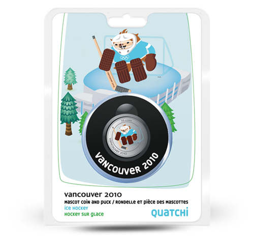 This puck comes with an expertly painted 50-cent nickel finish coloured coin featuring Vancouver 2010 Winter Olympic mascot Quatchi in a hockey pose.