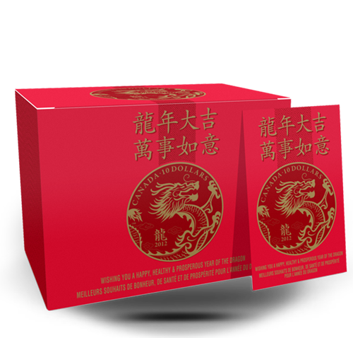 Coin is encapsulated, packaged along with the serialized certificate in a red cardboard pocket, and altogether presented in a red envelope with the coin design andChinese wishes printed on it in gold and red foil. Just like with the traditional red envelope used forChinese New Year, this will be a perfect gift giving opportunity for the Year of the Dragon.