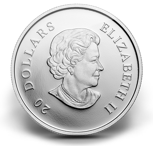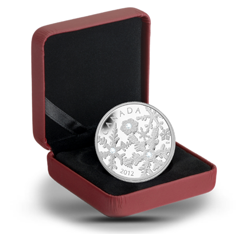 Your coin features six tumbling snowflakes engraved in exceptionaldetail. The three largest snowflakes feature opal white Swarovski crystal elements. This coin is engraved with the word “Canada” and the year “2012.”