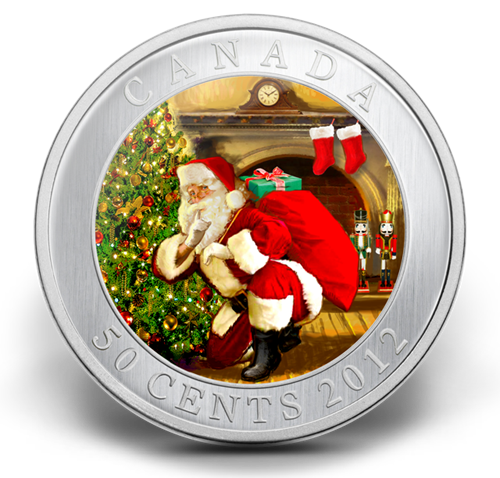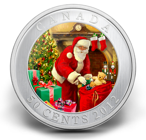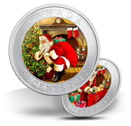 Your coin features two vibrantly coloured images of Santa unloading gifts and hushing the viewer in a cosy holiday parlour by Canadian artist Tony Bianco. The images switch when the coin is tipped; a feature rendered using lenticular technology.
