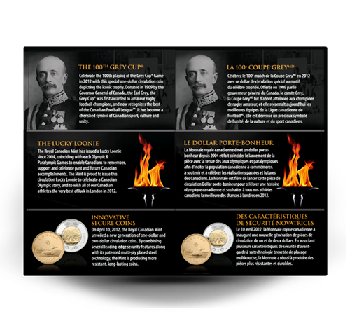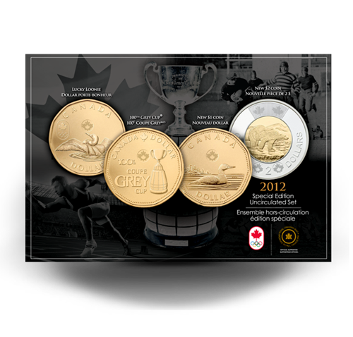 • Your special edition set contains a Lucky Loonie, CFL dollar, and a 2012 Loonie and Toonie with new security features!