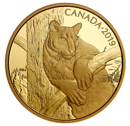 This $350 coin is 99.999% pure gold, with a diameter of 34 millimetres and a nominal metal weight of 35 grams. The reverse design by Canadian artist Denis Meyer Jr. features a cougar (Puma concolor) resting on a tree branch as it scans the horizon forsigns of danger or prey. The obverse features the effigy of Her Majesty Queen Elizabeth II by Susanna Blunt.