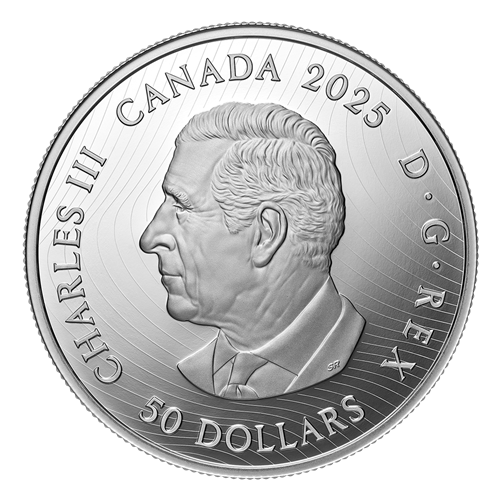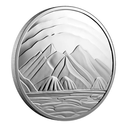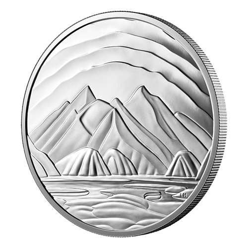 Your coin’s reverse features a carefully sculpted adaptation of Baffin Island Mountains (c. 1931), one of several Arctic canvases by Lawren Stewart Harris, the renowned landscape painter and a founding member of Canada’s famous Group of Seven painters. While Harris’ original oil painting features cool blues, bold browns and varying shades of white, this engraved interpretation uses different frostings and relief heights to re-create the dramatic contrast between the icy peaks and the radiant sky, as well as the rugged rocks and the icy water. The obverse features a wavy pattern and the effigy of His Majesty King Charles III by Canadian artist Steven Rosati.