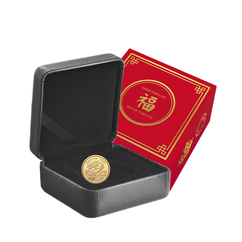 Your gold coin is presented in a Royal Canadian Mint-branded black clamshell and packaged in a red graphic beauty box, evoking the Chinese New Year “red envelope” tradition of bestowing a wish for luck and good fortune.