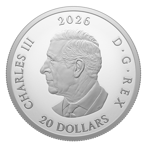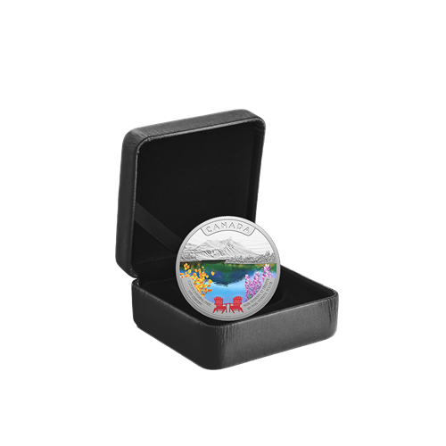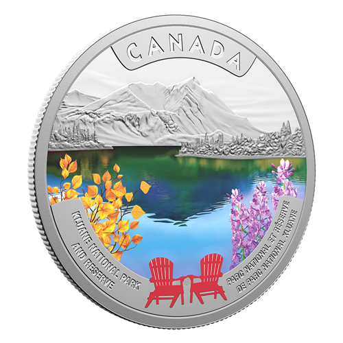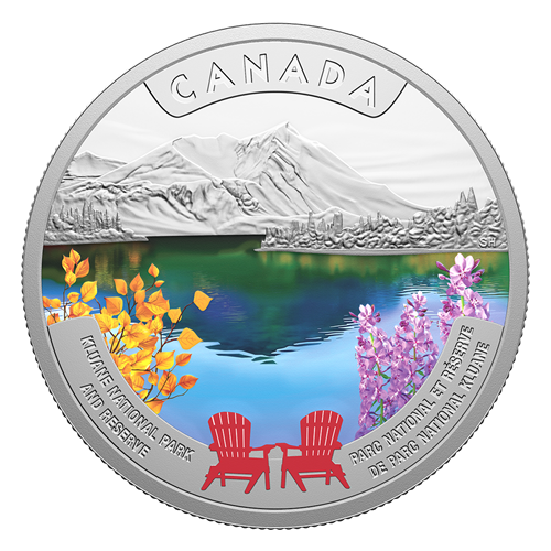 Designed by Canadian artist Steve Hepburn, your coin’s reverse invites you to take a seat and enjoy the view from Kluane National Park and Reserve, located in southwest Yukon. The view from the shore of Mät’àtäna Män (Kathleen Lake) is framed by the colourful branches of black cottonwood (Populus trichocarpa) and fireweed (Epilobium angustifolium) flowers, as the engraved King’s Throne Mountain is reflected on the colourful surface of the water. Selective colour also highlights two red Adirondack chairs—a familiar sight in Canada’s national parks. The obverse features the effigy of His Majesty King Charles III by Canadian artist Steven Rosati.