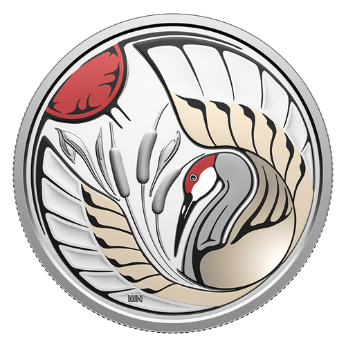 Designed by Anishinaabe artist Mark V. Nadjiwan, the coin’s reverse shows a red sun in the morning sky, with an additional touch of red colour on the top of the Sandhill Crane’s head. Ajijaak (the Crane) stands poised among the cattails, wings unfurled as if ready to lift its call across the land. The obverse features the effigy of His Majesty King Charles III by Canadian artist Steven Rosati.