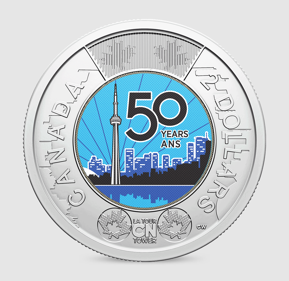 This commemorative $2 circulation coin celebrates the 50ᵗʰ anniversary of the CN Tower, the tallest freestanding structure in the Western Hemisphere and a glowing symbol of Canadian innovation.