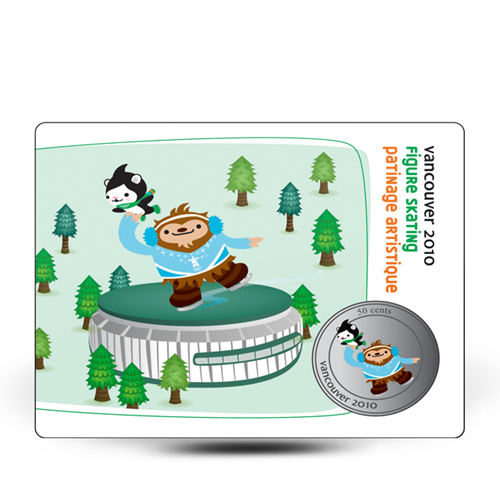 Kids will love these must-have collector cards featuring individual Vancouver 2010 mascots on a 50-cent nickel finish coloured coin. On this card Miga and Quatchi impress the figure skating judges!