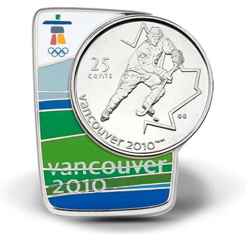 The lapel pin is cleverly designed with a strong magnetic strip so you can attach the accompanying uncirculated 25-cent coin which highlights the speed andcompetitiveness of Olympic hockey.