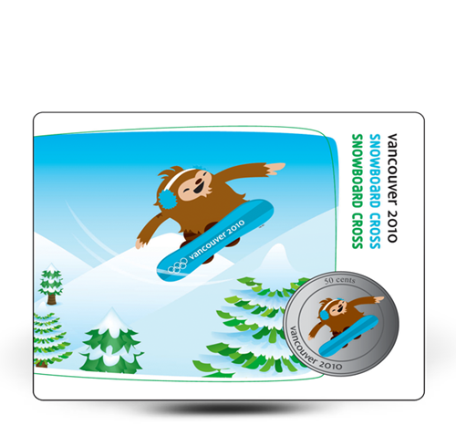 Kids will love these must-have collector cards featuring individual Vancouver 2010 mascots on a 50-cent nickel finish coloured coin. On this card Quatchi flies along in a snowboard cross race!