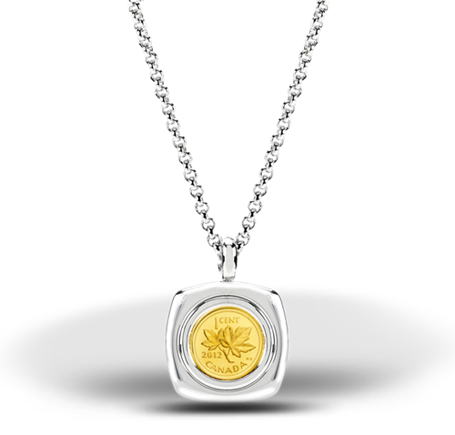 Your stunning 2012 sterling silver pendant features the 2012 1/25 ounce fine gold Farewell to the Penny commemorative coin. Designed by Birks, this pendant is the perfect gift for you or the beautiful woman in your life.