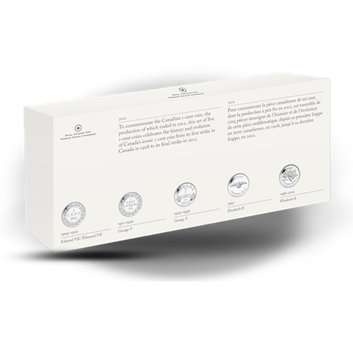 • A FIRST! This unique set features all thepenny’s reverse designs throughout Canadian historyuntil the penny’s last year in 2012 (including a special design by Alex Colville commemorating Canada’sCentennial in 1967).
