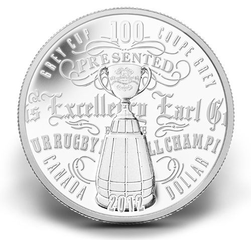 Designed by Bensimon Byrne, your coin features a stylized image of the Grey Cup Trophy mounted on its large base, set against a detail from the engraved text on the face of the Grey Cup. Embossed against this background is the number “100” in celebration of the 100th Grey Cup Game, the words “Grey Cup/Coupe Grey,” the face value, “Canada Dollar” and the year, “2012.”