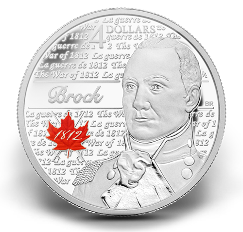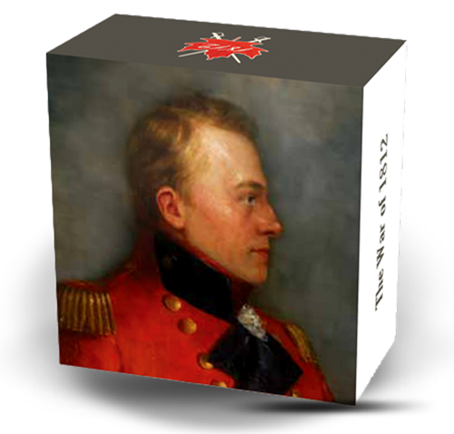 Your coin features Major-General Sir Isaac Brock against an intricately engraved background comprisedof the words “The War of 1812” in both English and French. Artist Bonnie Ross used various image sources of Brock to design the ideal image. Also featured in the design is the engraved and painted Governmentof Canada War of 1812 logo: it is composed of stylistic 1812 typography encompassed by a stylized mapleleaf with ecru swords crossing behind it.