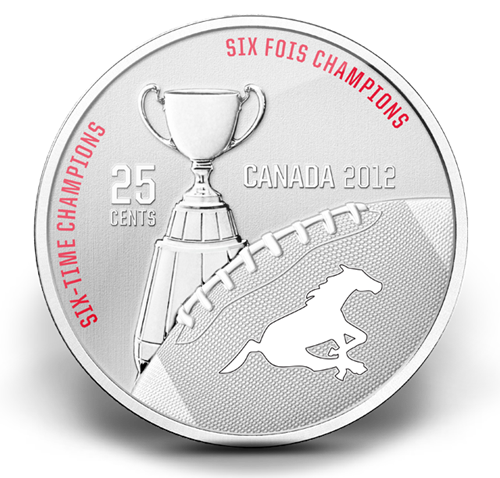 Your coin highlights the history and excitement of the CFL. The coin includes an image of the Grey Cup, the Calgary Stampeders logo on a football, and the text “Six-time Champions.”