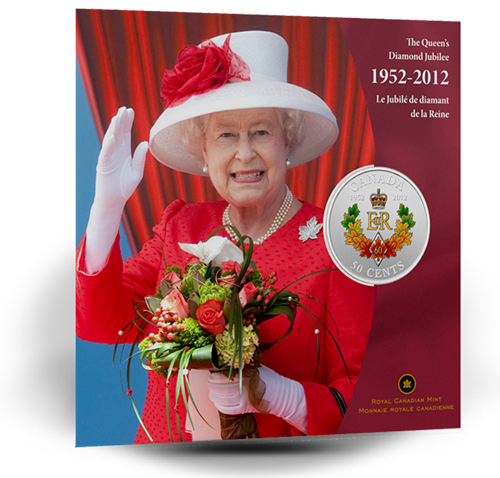• A larger coin plated in silver, packaged in a colourful folder featuring the image of The Queen wearing a Maple Leaf brooch and waving to Canadians during her official visit to Canada on Canada Day 2010.
