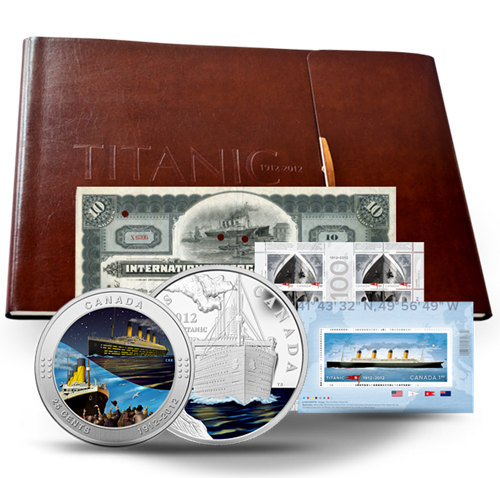 Your Titanic Collector’s Set includes a leather-bound embossed collectible album that tells the story of the tragedy from a Canadian perspective.Your set includes an authentic White Star stock certificate, circa early 1900s in a protective mount, all five stamps from Canada Post’s Titanic’s 100th Anniversary issue, two sold out Royal Canadian Mint Titanic coins, a special re-created Titanic cancel, and three Titanic postcards.