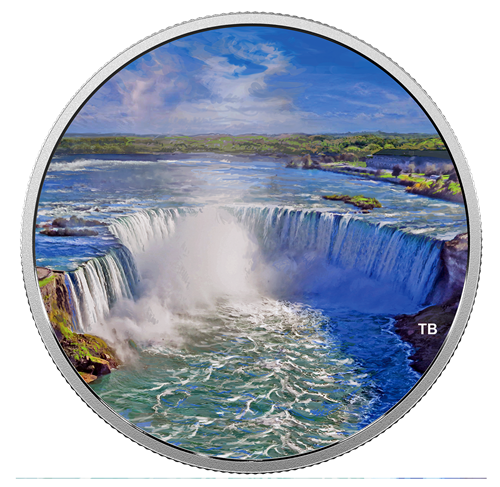 Youcan almost hear the thunderous roar of rushing water in this reverse design by Tony Bianco. The elevated view provides a sweeping panorama of the HorseshoeFalls in its near entirety. There’s a sense of movement above the falls, where the powerful current of the upper Niagara River and the Cascade Rapids sends water racing over the crescent-shaped cataract. Bordered by Goat Island on the left and the Ontario shore on the right, the world-famous waterfall naturally commands attention as a tremendous volume of water tumbles over the crestline and into the river below, releasing cooling plumes of mist into the air. A full colour application only adds to the picture-perfect setting, where the water is nearly as blue as the sky above. But there is a hidden elementto this design: a selective application of photoluminescent (glow-in-the-dark) and black light technologies allows for a second viewing of the scene, this time at night. A tradition since 1925, the nightly illumination of the falls adds an array of candy-likecolours to the water while Canada’s longest running fireworks series lights up the night sky,embodying the pride that many Canadians have for one of our most famous natural wonders. The obverse features the effigy of Her Majesty Queen Elizabeth II by Susanna Blunt.