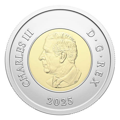 Designed by Canadian artist Mary-Ann Liu, sculptor of the bronze relief on Canada’s Tomb of the Unknown Soldier, the coin’s reverse commemorates the 25ᵗʰ anniversary of the repatriation of Canada’s Unknown Soldier. The inner core features a street-level view of the Tomb of the Unknown Soldier in front of the National War Memorial in Ottawa. The base of the granite tomb extends onto the outer ring, which bears the words “CANADA”, a face value of “2 DOLLARS”, the bilingual inscription “TOMB OF THE UNKNOWN SOLDIER LA TOMBE DU SOLDAT INCONNU”, and two maple leaf security features. The silhouettes of four sentries representing all Canadians who serve or have served appear behind the tomb. The inclusion of a poppy, bright red on the colourized coin, completes this poignant expression, honouring sacrifice and national service. The obverse features the effigy of His Majesty King Charles III by Canadian artist Steven Rosati.
