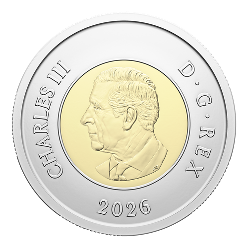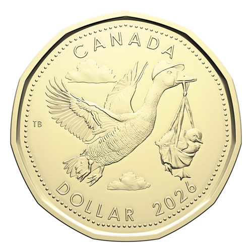Designed by Canadian artist Tony Bianco, the $1 coin in the 2026 Baby Gift Card Set puts a Canadian spin on the classic image of a baby-delivering stork, by featuring a Canada goose and gosling instead. The obverse features the effigy of His Majesty King Charles III by Canadian artist Steven Rosati.