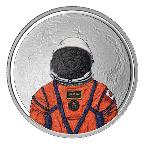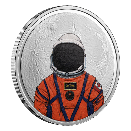 Under normal lighting conditions, this fully engraved 1 oz. 99.99% pure silver coin presents a selectively coloured portrait of a CSA astronaut, backed by the Moon. Under black light, the coin reveals hidden details: the scene is illuminated by Moon glow, and the Earth is reflected in the astronaut’s visor.