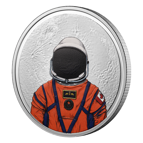 Designed by Canadian artist Pandora Young, the coin’s reverse celebrates Canada’s role in the international NASA-led Artemis II mission through its depiction of a Canadian Space Agency astronaut in space, backed by an enlarged view of the Moon. Selective colour brings the astronaut’s blue-trimmed, orange-coloured Orion Crew Survival System spacesuit to life, with the Canadian flag visible on the shoulder. When viewed under black light, the engraved Moon in the background glows, while the iconic view of Earth from the Moon is reflected in the astronaut’s visor. The obverse features the effigy of His Majesty King Charles III by Canadian artist Steven Rosati.
