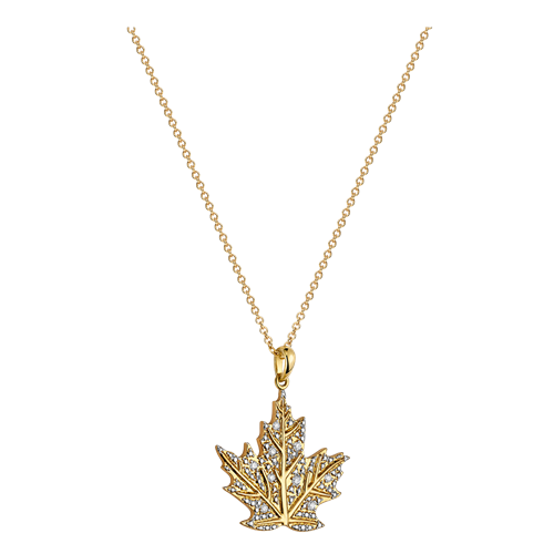 - Dotted with diamonds. Nine round, Canadian-sourced, brilliant cut diamonds (0.15 tcw) are artfully set across the leaf’s lobes, capturing light and adding refined brilliance to every angle.