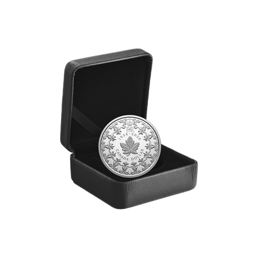 This 99.99% pure silver dollar marks the 100th anniversary of Queen Elizabeth II’s birth by presenting a uniquely Canadian tribute: a representation of the Diamond Maple Leaf Brooch worn by Queen Elizabeth II as a symbol of her personal connection to Canada, accompanied by the Royal Cypher (top) that served as her personal device. A flourish of filigree crowns the noble leaf, symbolizing grace and heritage, and includes 13 maple leaves (one for each province and territory) that lie nestled in the filigree’s negative space—a subtle-but-profound tribute threaded through the artistry, much like Queen Elizabeth II’s steadfast presence in Canada’s story.