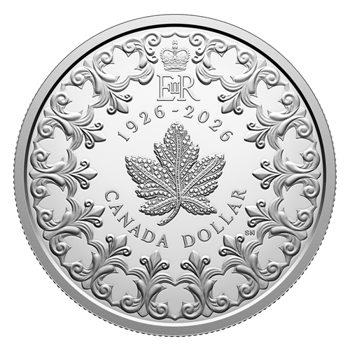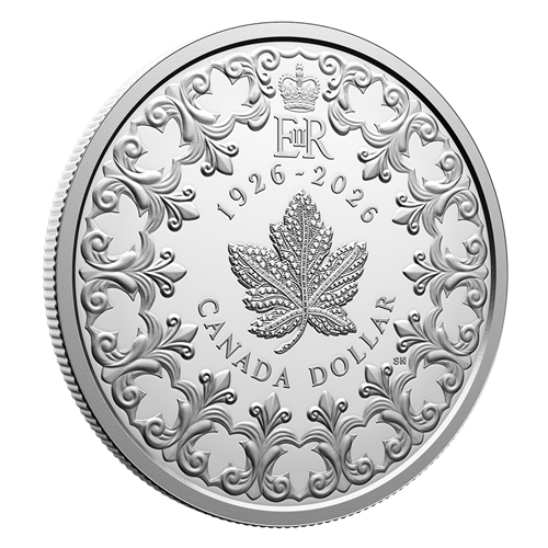Designed by Canadian artist Simon Ng, the reverse features an engraved representation of the Diamond Maple Leaf Brooch surrounded by decorative filigree. In the centre portion of the design, the artist’s take on the royal brooch is positioned between the words “CANADA” and “DOLLAR” and the double dates “1926-2026” commemorating the 100th anniversary of the birth of Queen Elizabeth II, whose Royal Cypher appears at the top. The negative space within the filigree forms the shape of a maple leaf, with 13 leaves representing each of Canada’s provinces and territories. The obverse features the effigy of Queen Elizabeth II by Susanna Blunt.
