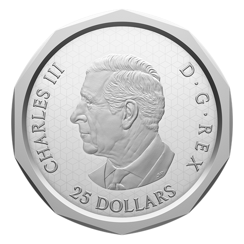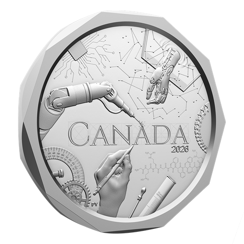 Honouring Canada’s engineers, the reverse design by artist Pandora Young celebrates the innovation and achievements of the field, represented through stylized elements inspired by different fields of engineering (clockwise from top): a computer screen with a robotic hand, set against an AI-inspired dot design; a wire gauge; the chemical diagram for insulin partially shown; a test tube and dropper; a hand holding a pencil; a spur gear next to a compass and the tip of a protractor; a soldering iron; a computer chip; and at the centre, the word “CANADA” appears in blueprint lettering. The raised rim is uniquely shaped to resemble the Iron Ring worn by Canadian engineers as a symbol of professional obligation. The obverse features the effigy of His Majesty King Charles III by Canadian artist Steven Rosati.