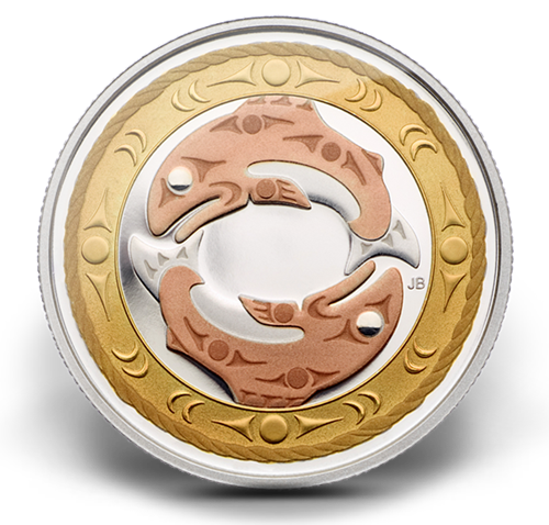 « Source de vie », ce poisson était l’objet d’un véritable culte, en particulier l’espèce la plus grande, le saumon quinnat, qu’on appelait tyee, c’est-à-dire « le roi ». Le voici traité à la hauteur de son importance culturelle ancestrale, revêtu d’or rose et cerclé d’or jaune sur une superbe pièce en argent pur.
