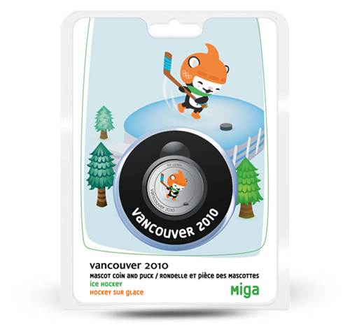 En voici une sertie d’une pièce nickelée de 50 cents où apparaît, colorée de main de maître, Miga dans une pose de hockey olympique.