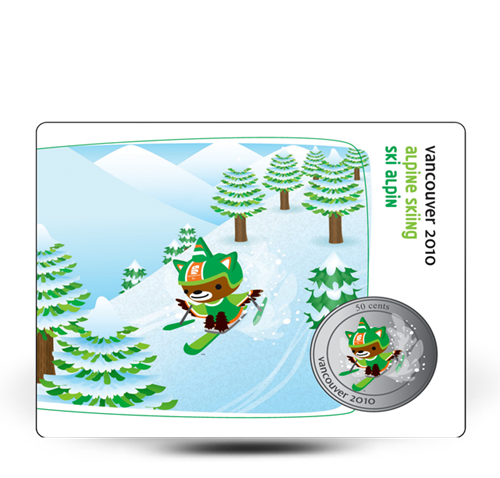 Les enfants raffoleront de ces cartes montrant chacune une mascotte de Vancouver 2010 en couleur sur une pièce nickelée de 50 cents. Voici Sumi qui brille en ski alpinparalympique!