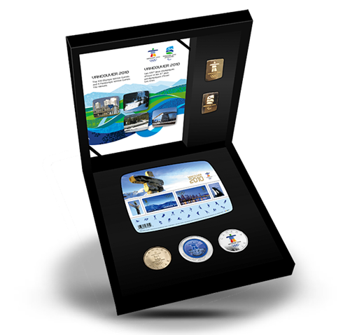 • Deux dollars au fini différent (doré et coloré) frappés del’emblème officiel des Jeux d’hiver de Vancouver
