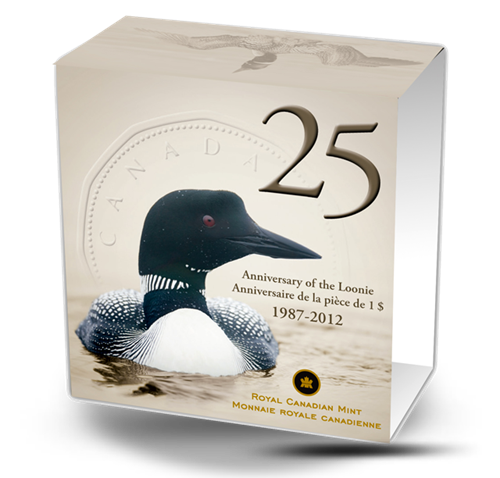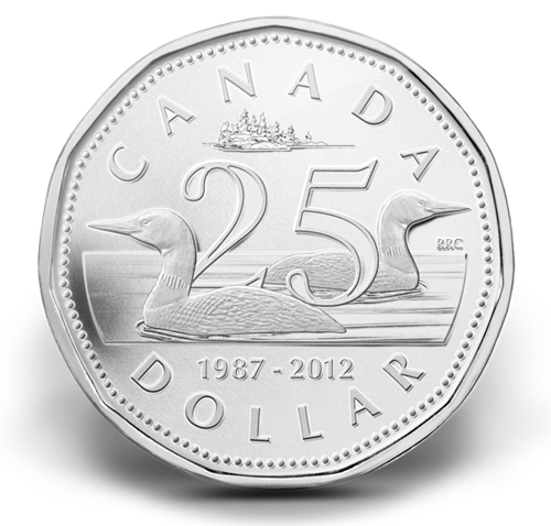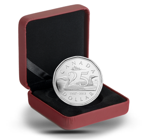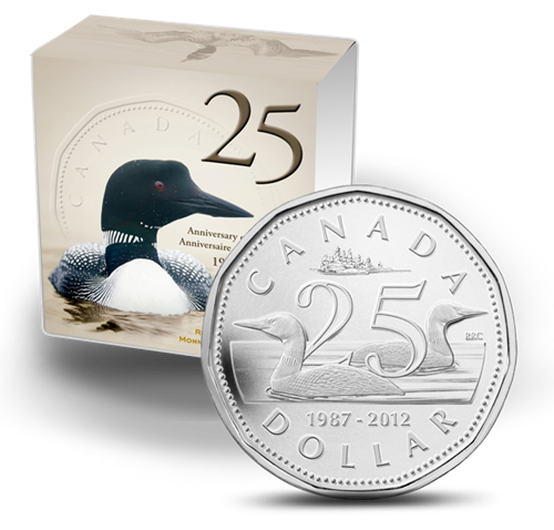 Une pièce au fini perlé unique pour célébrer un anniversaire bien spécial! En 2012, la Monnaie royale canadienne célèbre le 25e anniversaire de la pièce de un dollar, pièce canadienne emblématique au motif du plongeon huard.