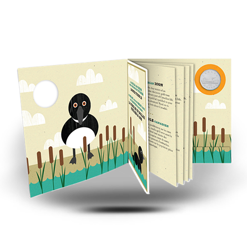 Accompagnée d’un huard jouet en papier à assembler et d’un livret avec illustrations en couleurs racontant l’histoire de la pièce de un dollar :