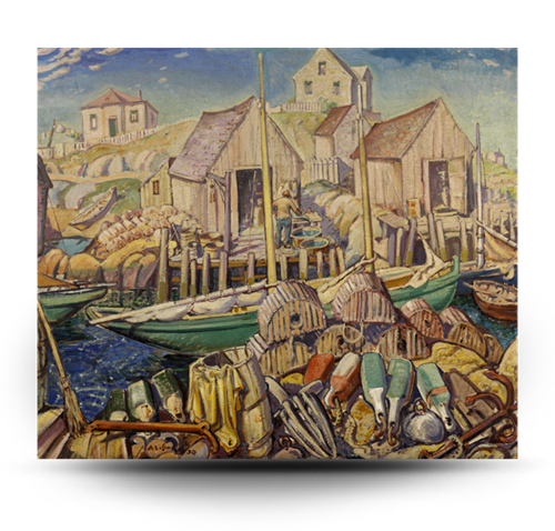 Tout au long de sa longue carrière de peintre, Arthur Lismer asillonné le Canada et, en 1930, il a visité le Nouveau-Brunswick et la Nouvelle-Écosse, où il a produitcertaines de ses œuvres les plus intemporelles. Dans son tableau Village de pêcheurs en Nouvelle-Écosse, les détails des objets maritimes sont reproduits avec une grande vivacité de coloris.