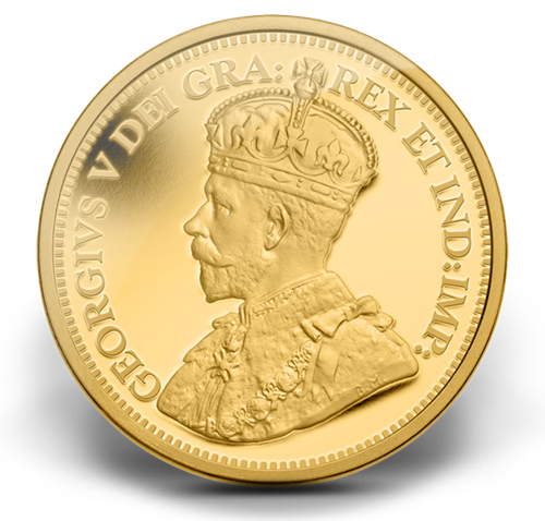 L’avers est à l’effigie du roiGeorges V. Cette superbe pièce de 5 onces en or pur porte deséléments du motif original de 1912!