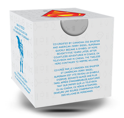 • La pièce comporte une inscription en kryptonien, langue maternelle fictive de Superman imaginée par DC Comics, signifiant « SUPERMAN,75 ANS DÉJÀ ».