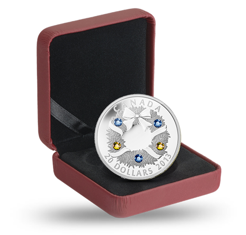 La pièce est encapsulée et présentée dans un boîtier à double coque bordeaux rembourréet orné du logo de la Monnaie royale canadienne. Le boîtier est assorti d’un fourreau protecteur noir.