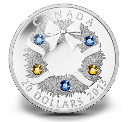 Le motif au revers, conçu par l’artiste canadien Maurice Gervais, représente une couronne de Noël ornée de cinq éléments Swarovski bleus et dorés.